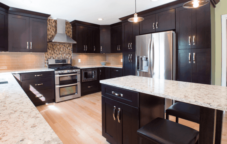 | Wood Corner Brackets, with Wood I-Beam Construction | Cabinet finish is a dark brown, it is not black |